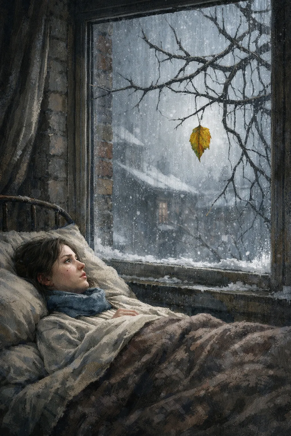 苏艾在一层他的黯淡、狭小的屋子里,找到了贝尔曼,闻到了他浑身浓烈的杜松子酒味。在屋子的一角,立着他的画架,画架上面绷着一块空白的画布。这画架和画布立在那里已经二十五年了,一直等待着他画出他的杰作的第一个线条。苏艾把琼西荒唐的想法告诉了贝尔曼,还把自己的担心也告诉了他,生怕琼西一旦失去了对世界的最后一丝儿牵挂,弱不禁风的她真的会像一片叶子那样凋零、飘逝。